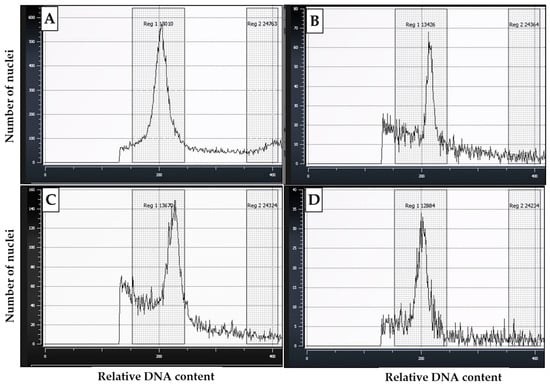Representative flow cytometric histograms of pollen and leaf nuclear preparations for cassava: (A) cassava young leaf (control); (B,C) pollen samples picked at anthesis from RL-treated flowers; (D) pollen sample picked at anthesis from non-treated plants.