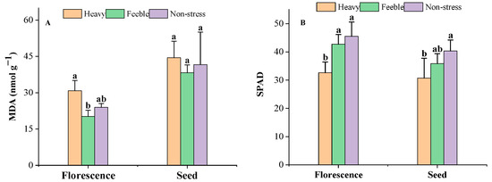 It was observed that drought stress did not affect the MDA content significantly in the florescence or seed stage (Figure 1A). Heavy drought stress significantly decreased the SPAD in both stages, but feeble drought did not affect the SPAD (Figure 1B).