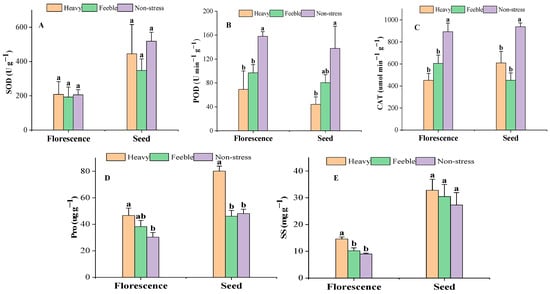 At the florescence stage, the SOD activity was almost steady under drought stress (Figure 2A) and there was also no significant difference at the seed stage. At both florescence and seed stages, the leaf POD activity of A. canescens from the heavy drought group was less than half of that of the non-stress group; the difference was significant. The POD activity of A. canescens from the feeble drought group was significantly lower than in the non-stress group at florescence stage, but not significantly at seed stage. The CAT activity showed the same pattern as the POD at florescence stage but was inconsistent at the seed stage. At the seed stage, the CAT activity of A. canescens under heavy and feeble drought were both significantly lower than in the non-stress group. At the florescence stage, both the Pro and SS contents showed the same pattern in that the value of the heavy drought group was significantly higher than that of non-stress group (Figure 2D,E). At the seed stage, the Pro of the heavy drought group showed the same pattern as that of the florescence stage, but there was no significant difference in SS. Feeble drought stress did not affect the Pro and SS in the florescence or seed stage.