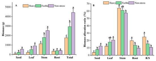 The biomass (A) and biomass allocation ratio (B) under drought stress. Total means the biomass of all the organs; R/S means root/shoot ratio. Different letters above the error bar (a, b and c) in the same indicators at the same stage mean a significant difference (p ≤ 0.05).