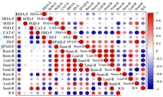 At the florescence stage, the MDA content was negatively correlated with the biomass of the root, stem, leaf, seed and the total, and both the POD and CAT activity were positively correlated with seed ratio and negatively correlated with root ratio, while the Pro and SS were negatively correlated with seed ratio and positively correlated with root ratio (Figure 4). The SS was also negatively correlated with stem and total biomass and positively correlated with R/S. SPAD was positively correlated to all biomass indicators and leaf ratio, while it has a negatively correlation with stem ratio and R/S. At the seed stage, the POD was positively correlated with seed ratio and negatively correlated with root ratio, while the Pro was negatively correlated with biomass, leaf and seed allocation ratio and positively correlated with root allocation ratio and R/S. Most of the correlations reached a significant level. The SPAD had a positive correlation with biomass indicators and leaf and seed allocation ratio, and had negative correlations with root and stem allocation ratio and R/S.