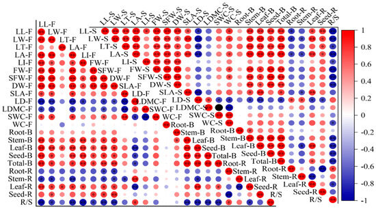 At the florescence stage, the indicators related to leaf shape and weight were positively correlated with biomass and leaf and seed allocation ratio, and negatively correlated with root and stem allocation ratio and R/S (Figure 5). The LD was positively correlated with stem allocation ratio and R/S and negatively correlated with leaf, seed and total biomass. The SLA was negatively correlated with stem allocation ratio. There were no significant correlations between leaf morphological traits and root biomass, and only SFW and DW showed significant negative correlations with root biomass allocation ratio. The correlations at seed stage showed same pattern as that of the florescence stage, but SLA had significant correlations with stem, leaf and total biomass and leaf allocation ratio.