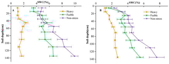 Soil water content (SWC) of florescence stage (A) and seed stage (B) in different fields. Heavy means heavy drought stress; feeble means feeble drought stress; non-stress means no drought stress. Error bars represent standard deviation. The same below.