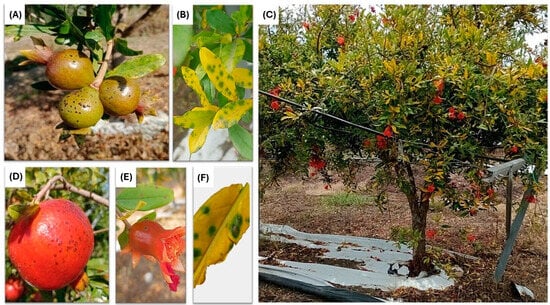 Black and brown spots on fruits, leaves, and flowers of pomegranate. (A) Numerous necrotic spots on fruits; spots become crusty and occasionally coalesce. (B) Pinpoint necrotic spots on young pomegranate leaves. (C) Defoliation of twigs and severe chlorosis of pomegranate leaves and black spots on their surfaces. (D) External symptoms of black spots on fruit. (E) Black spot symptoms on pomegranate flower (F). Close-up image of necrotic spots on leaf.