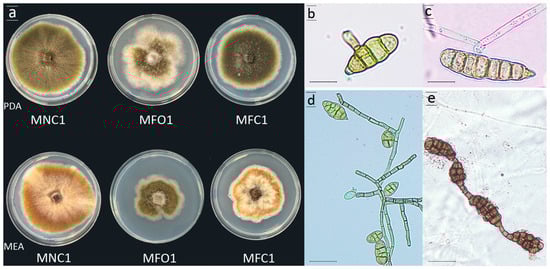 (a) Growth patterns and colony morphologies of isolates of Alternaria spp. recovered from pomegranate fruits and leaves with symptoms of Alternaria black spot collected in Sicily. From left to right: MNC1, MFO1, and MFC1 isolates, each representing a distinct morphotype (morphotype 1, 2, and 3, respectively), grown on PDA (top) and MEA (bottom), and incubated at 25 ± 1 °C for 7 days in the dark; (b,c) microscope images of germinating conidia of Alternaria alternata (MNC1 and MFO1) and A. arborescens (MFC1), respectively; and (d,e) septate conidia and hyphae of MNC1 and MFC1 isolates, respectively.