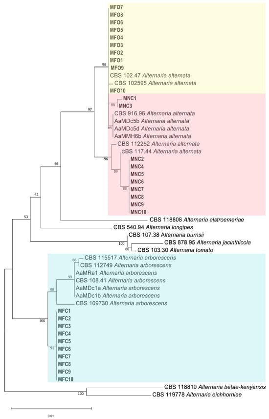 GeneAmp PCR System 9700 (Applied Biosystems, Monza-Brianza, Italy) was used for the PCR amplifications. Taq DNA polymerase recombinant (Invitrogen™) was used for all PCR reactions, performed at a total volume of 25 µL containing a PCR buffer (1×), a dNTP mix (0.2 mM), MgCl2 (1.5 mM), forward and reverse primers (0.5 µM each), Taq DNA polymerase (1 U), and 1 µL of genomic DNA. The reaction protocol comprised an initial denaturation at 94 °C for 3 min followed by 35 cycles of denaturation at 94 °C for 30 s, annealing at 55 °C (for the ITS region), 58 °C (for EF-1α), 54 °C (for GAPDH), or 62 °C (for OPA10-2) for 30 s, and an extension at 72 °C for 30 s, with a final extension at 72 °C for 10 min. The resulting amplicons were visualized on a 1% agarose gel, and the purified products were sequenced with both forward and reverse primers by Macrogen Europe (Amsterdam, The Netherlands). The sequences were analyzed using FinchTV v.1.4.0, and the obtained sequences were deposited in GenBank (Table 1). For molecular identification, the sequences from isolates characterized in this study and validated sequences of reference Alternaria isolates (Table 2) were used for phylogenetic analysis. Prior to analysis, the complete panel of reference sequences underwent the elimination of duplicates utilizing the Elim Dupes software (accessed on 15 June 2020). The sequences were aligned using MUSCLE and analyzed using MEGA6 for phylogenetic reconstruction using the maximum-likelihood method with the Tamura–Nei model []. Bootstrap analysis with 1000 replications was conducted. To enhance this investigation with the genetic diversity among the isolates obtained in this study, a combined dataset of all sequenced markers (ITS, EF-1α, GAPDH, and OPA10-2) was employed for phylogenetic analysis.
