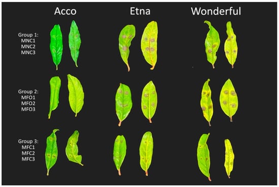 Differential susceptibility of leaves of pomegranate cultivars Acco, Etna, and Wonderful to infection by nine Alternaria isolates of the three diverse morphotypes (morphotypes 1, 2, and 3, indicated as groups 1, 2, and 3, respectively). In detail, group 1: MNC1, MNC2, and MNC3; group 2: MFO1, MFO2, and MFO3; and group 3: MFC1, MFC2, and MFC3. Necrotic spots with a chlorotic halo on fully expanded young leaves inoculated with a conidial suspension (106 conidia mL−1) without wounding, three days after inoculation (dpi).
