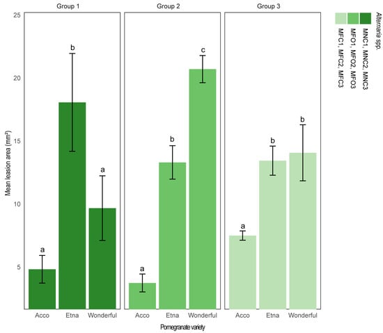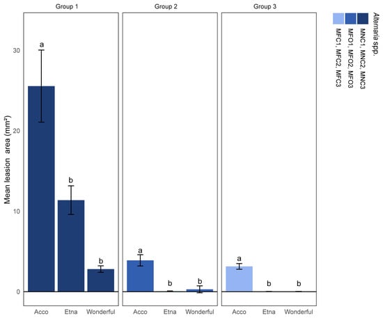 Differential susceptibility of ripe fruits of pomegranate cultivars Acco, Etna, and Wonderful to infection by nine Alternaria isolates of three diverse morphotypes (morphotypes 1, 2, and 3, indicated as groups 1, 2, and 3, respectively). Mean area (±SD) of necrotic lesions (mm2) induced by each group of isolates on pomegranate fruits inoculated with a conidial suspension (106 conidia mL −1), without wounding, 10 dpi. Within each group of isolates, values sharing the same letters are not statistically different according to Tukey’s honestly significant difference (HSD) test (p ≤ 0.05).