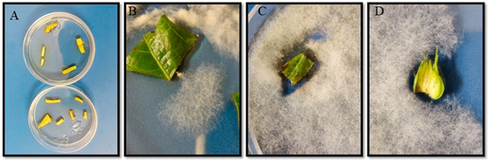 (A) Plant sample cultures collected from endophytic plants to test the presence of fungal endophytes in roots, stems, leaves, and squares of cotton plants; (B,C) fungal endophyte growing from leaves of endophytic plants; (D) fungus growing from squares of endophytic cotton plants.