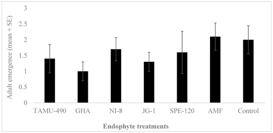 Lygus lineolaris adult emergence on endophyte-treated cotton plants (mean ± SE). Second instars were introduced to the plants, and adult emergence was recorded after 8 days. Data were analyzed by ANOVA using JMP software (v. 10, SAS Inc., Cary, NC, USA). No significant differences were observed in the adult emergence of Lygus lineolaris on different endophytic cotton plants.