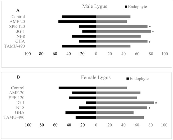 Behavioral response of Lygus lineolaris (A) males and (B) females towards endophytic cotton squares in olfactometer assays. * indicates a significant difference in their behavioral choice towards endophytic squares compared with control squares (α = 0.05).
