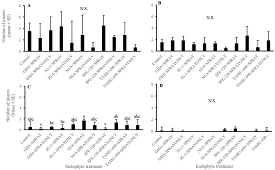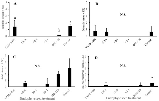 Field sampling of tarnished plant bug nymphs and adults on plant terminals showed a significantly fewer number of first–third-instar nymphs on SPE-120-treated plants compared to TAMU-490 and control plants. No early instar nymphs were observed on GHA, NI-8, and JG-1 endophyte-treated plants (p < 0.05) (Figure 5A). No significant differences were observed in the number of late instar nymphs (4th–5th) or adults observed on different endophyte-treated plants and control (p > 0.05) (Figure 5B,C). Also, no differences were observed in the number of different instar cotton bollworm larvae observed on the treated and control plants (Figure 5D). Some treatment plants did not receive any stages of tarnished plant bugs or cotton bollworm larvae.