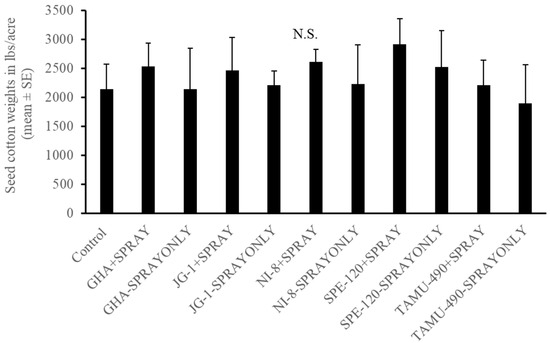 In the experiment where second-instar L. lineolaris nymphs were introduced in the top five nodes of cotton plants under field conditions, no differences were observed in the development of third-instar or fourth-instar plant bug nymphs (p > 0.05) (Figure 6A,B). A combination of seed treatment alone, foliar spray alone, or in combination had no effect on their development. Endophytic seed treatment of GHA combined with endophyte foliar spray and SPE-120 seed treatment combined with foliar spray had the lowest number of fifth-instar L. lineolaris nymphs than other treatments post threshold and foliar endophyte spray (p < 0.05) (Figure 6C). No differences were observed in the development and adult emergence of L. lineolaris on the different endophytic treatments (p > 0.05) (Figure 6D). Cotton was harvested from individual treatment plots. No significant differences were observed in the yield of cotton produced under different endophyte seed treated with spray alone or combination treatments (p > 0.05) (Figure 7). Even though the yield was numerically higher in SPE-120 seed + spray treatments than controls, the yield did not show a statistical difference.