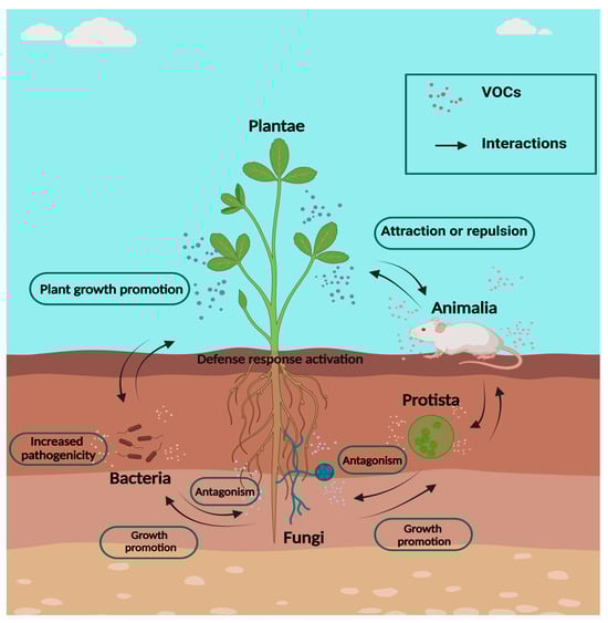 The most prevalent mVOCs are derived from fatty acids, including alcohols, alkanes, alkenes, aromatic compounds, and compounds containing sulfur, nitrogen, and terpenoids [16]. In agriculture, communication and interaction in the soil ecosystem between plants and microbes play a crucial role in structuring soil bacterial communities, which ultimately determine the growth of the plant and its health, which is reflected in agricultural productivity [17].