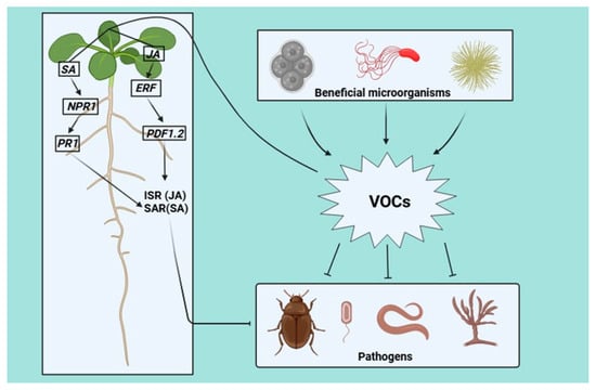 The protection established by the emission of VOCs of bacterial and fungal origin is one of the most studied, particularly microorganisms and compounds that combat pathogens such as insects, bacteria, fungi, and nematodes. Additionally, these VOCs activate defense responses in plants through the increment in JA and SA phytohormone concentration, therefore the activation of ERF and NPR transcription factors and the subsequent induction of PDF1.2 and PR1 defense genes expression to finally trigger the ISR and SAR pathways, thus generating indirect protection, which is related to the plant’s own chemical and molecular mechanisms. Lines with arrows indicate activation and broken lines indicate inhibition.