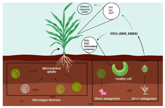The most common way to use microalgae is through the use of biomass and biofertilizers [91]. Microalgae combat pathogens by direct antagonism or indirectly, and once plants detect pathogens, they promote the activation of their defense pathways [92]. Plant defenses are activated by polysaccharides produced by microalgae, which function as elicitors (Figure 3) [93]. In S. lycopersicum (L.), plants injected with 0.2 mg mL−1 of crude extract of polysaccharides from four strains of green microalgae (Chlorella vulgaris, C. sorokiniana, Chlamydomonas reinhardtii, and Dunaliella salina) showed an increase in β-1,3-glucanase activity increased as well as the activity of enzymes involved in the synthesis of SA (such as PAL) and JA (such as lipoxygenase) and antioxidant enzymes (APX, POD, and CAT), which are involved in establishing defense in plants for pathogen cell wall breakdown and in the synthesis of phytohormones that activate SAR or ISR [94].
