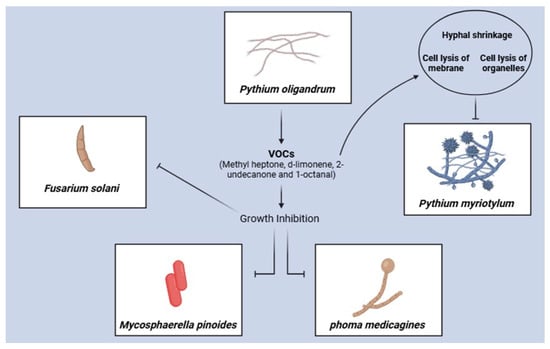 One of the first studies involving the activity of VOCs emitted by oomycetes (oVOCs) P. oligandrum dates back to 1991 [106], which showed that these compounds inhibit the growth of fungi (Figure 4), such as F. solani, Phoma medicaginis (syn. Ascochyta medicaginicola), and M. pinodes (syn. Didymella pinodes), which is a pathogen of peas. Sheihk et al. (2023) [107] evaluated the effect of oVOCs produced by P oligandrum to investigate whether they contribute to antagonism against the oomycete P. myriotylum. The oVOCs emitted by P. oligandrum inhibited the growth of P. myriotylum by 80% and the zoospore levels by 60%. Among the 23 oVOCs identified, methyl heptenone, d-limonene, 2-undecanone, and 1-octanal were potent inhibitors of P. myriotylum growth. Exposure to oVOCs led to hyphal shrinkage and the cell lysis of membranes and organelles of P. myriotylum. Previous data show that oVOCs are another mechanism linked to the parasitism of P. oligandrum in addition to the widely reported hydrolytic enzymes.