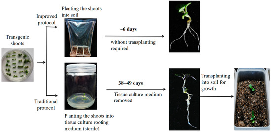 The Agrobacterium-mediated genetic transformation method was previously established in S. nigrum, utilizing a sterile rooting culture medium for inducing roots in transgenic shoots [2,3]. This process typically lasted about 5 weeks for tetraploid and hexaploid S. nigrum, and 7 weeks for diploid S. americanum. This duration was considerably lengthy. Additionally, transplanted whole transgenic plantlets often suffered from labor-intensive removal of agar and damaged root hairs. In our study, we developed an improved and convenient transformation method that significantly shortens the transformation period, allowing for the generation of transgenic S. nigrum plantlets capable of soil growth. This method facilitates root induction directly in soil, a non-sterile environment. This new approach simplifies the generation of soil-growth plantlets and represents a significant advancement in genetic transformation techniques. We believe this method can be broadly applied to enhance genetic transformation protocols and expedite tissue culture propagation in other plant species as well.