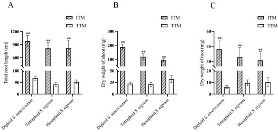 A comparative analysis of the improved method and traditional transformation methods in three S. nigrum species. A comparative anslysis of total root lengths (A), dry root weights (B), and dry shoot weights (C). The data were measured at 49 dpt (diploid S. americanum), 38 dpt (tetraploid S. nigrum), and 38 dpt (tetraploid S. nigrum). ** p < 0.01. Values are mean ± SD of three independent replicates. ITM: improved transformation method; TTM: traditional transformation method.