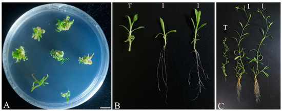 Rapid root generation in carnations using our improved method. Induction of shoots (A). Comparison of the transgenic plantlets generated using the improved method and the traditional method (B,C). The transgenic plantlets were grown at 10 dpt (B) and 75 dpt (C), respectively. Letters T and I indicate transgenic plant(s) produced via the traditional transformation method and the improved transformation method, respectively. Bars = 1 cm.