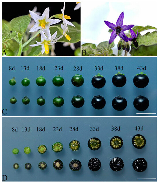 Ectopic expression of AcMYB110 in S. americanum plants induced anthocyanin accumulation in the flowers and fruits. Wild-type flowers (A); flowers of 35S::AcMYB110 overexpression plant (B); fruits at different developmental stages; wild-type fruits (upper row) and 35S::AcMYB110 fruits (lower row) (C,D); section D shows cross-sections of the fruits. Bars = 0.5 cm.