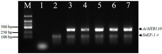 RT-PCR analysis of transgenic S. americanum expressing AcMYB110. Lane 1, ddH2O used as a template (blank control); Lane 2, Wild-type plant used as a negative control; Lanes 3–7, DsRed2-positive independent transgenic plants transformed with pBM110 plasmid; M, DL2000 bp DNA ladder (Sangon Biotech Co., Shanghai, China). SnEF-1α was used as the reference gene.