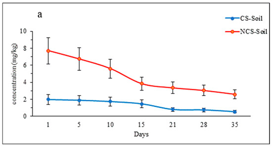 The concentration of IMI in the soil varied temporally and among the soil types, with NCS showing the highest concentration of IMI after 1 day of application (Figure 1a). The concentration of IMI was 7.7 and 2.0 mg/kg on day 1 and decreased to 2.6 and 0.5 mg/kg on day 35 for NCS and CS, respectively. Overall, this represents a 52.7% and 50.8% reduction in the IMI concentration over the study period for CS and NCS, respectively.
