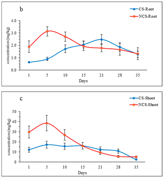 Once IMI is taken up by the plant roots, it is transported from the roots to the shoots through translocation [16]. A rapid increase in concentration was observed during the first few days of exposure (Figure 1c). In both soils, the highest concentration of IMI in shoots was reached after approximately 5 days of exposure. The average concentrations of IMI in plant shoots were reported as 12.4 mg/kg in CS and 18.7 mg/kg in NCS. This varies from the roots, where the maximum concentration in CS was reached at approximately 21 days.