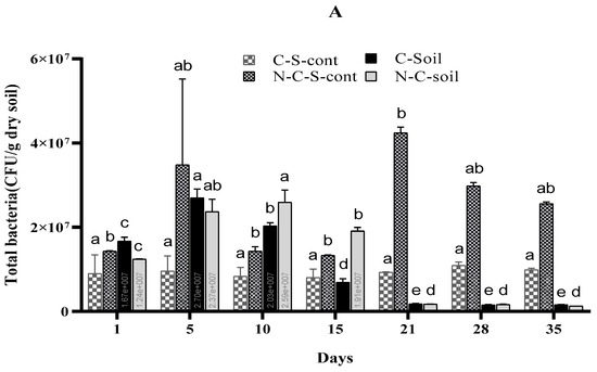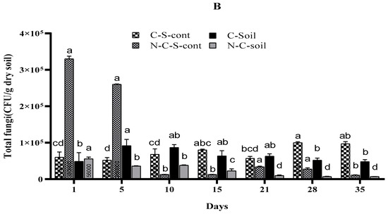(A,B): The variation in a population of heterotrophic bacteria (A) and fungi (B) among different days of IMI exposure. Where: (CS) = cultivated soil, (NCS) = non-cultivated soil, (C-S-cont = cultivated soil control, and (N-C-S-cont) = non-cultivated soil control. Each point is the mean of three replications ± standard error. For a given sampling day, treatments sharing the same letter are not significantly different.