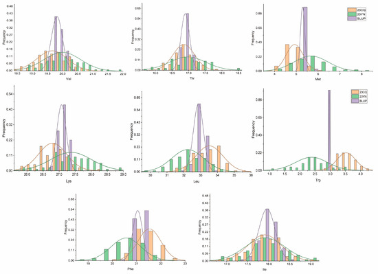 Distribution of eight essential amino acid content in F2:5, F2:6, and BLUP.