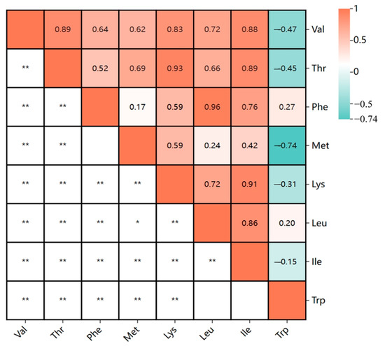 Correlation analysis of eight essential amino acid contents (** = p < 0.001, * = p < 0.05. The data in this table are the average results of three environments).