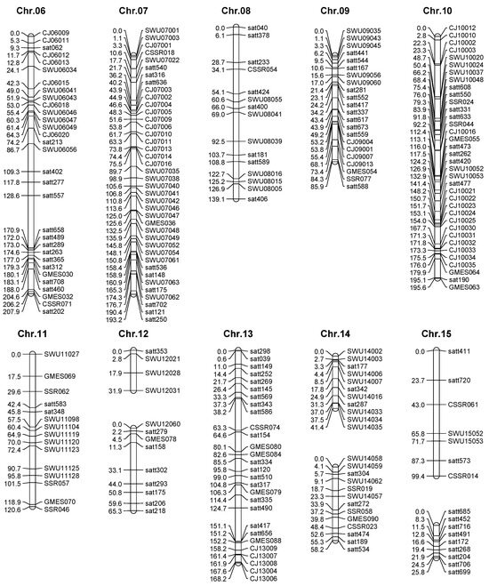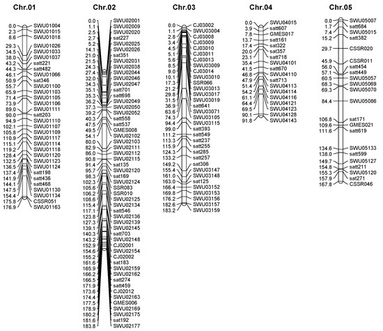 Genomic DNA was extracted from 189 plants, including the F2 population, the two parents, and F1 plant. A total of 2933 SSR primer pairs were synthesized by Biotech Bioengineering Co., Ltd. (Shanghai, China), derived from the soybean database SoyBase (http://www.soybase.org, accessed on 9 March 2024) [33]. Some of these BARCSOYSSR primers were renamed as SWU in this study. And a total of 162 insertion-deletion (InDel) primer pairs were synthesized based on comparing parental 10 × resequencing data with the soybean Wm82.a4.v1 reference genome, selecting InDel sites > 15 bp as markers. The primer sequence of SSR and InDel were listed in Table S1. The PCR amplification, following the protocol described by Zhang et al. [34], utilized primers containing polymorphisms between the two mapping parents for genotyping the individual plants of the F2 population. The band types identical to CJC2 and JY166 were recorded as A and B, respectively, while the heterozygous band type was labeled as H, and the deletion was denoted as U. The resulting data were then collected for further analysis, revealing the definition of additive effects for the CJC2 allele, signifying that positive genetic effects were present, indicating that CJC2 alleles contribute to increased phenotypic values.
