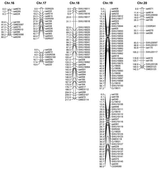 Based on the resequencing data of CJC2 and JY166, 162 pairs of InDel primers were selected. After genotyping the parental lines, 64 pairs of primers were used in constructing the genetic map. Combined with the previous genetic map constructed in our laboratory [21], a new linkage map was constructed, which contained 582 maker loci distributed across the 20 chromosomes of soybeans. The genetic map was 2881.2 cm in length, with an average map distance of 5.27 cm (Figure 3). The longest linkage map was 217.4 cm of chromosome 18; the shortest was 60.2 cm of chromosome 16. The maximum number of markers was 63 on chromosome 19, and the minimum number of markers was 10 on chromosome 16. The longest average distance between markers was 9.27 cm on chromosome 8, and the shortest average distance between markers was 2.43 on chromosome 19.