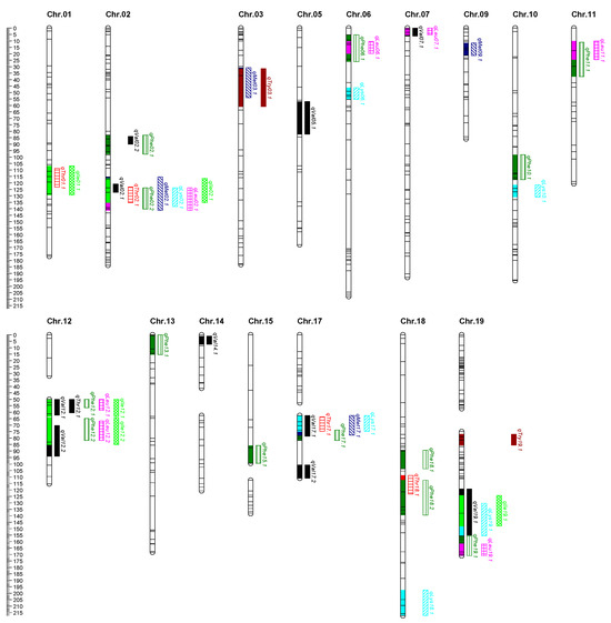 Following the principle of stability and effectiveness, a total of 13 QTL clusters were located on 10 chromosomes in this study (Table 3). In terms of controlling quantitative traits, Loci02.1 contains the highest number of a total of 7 QTLs. One QTL cluster of five traits was Loci12.1, and two QTL clusters of four traits were Loci12.2 and Loci17.1, while the one QTL cluster of three traits was Loci19.1. The remaining QTL clusters were all for two traits. In terms of the number of controlled traits and stability of detected QTL, two important clusters were Loci02.1 and Loci11.1.
