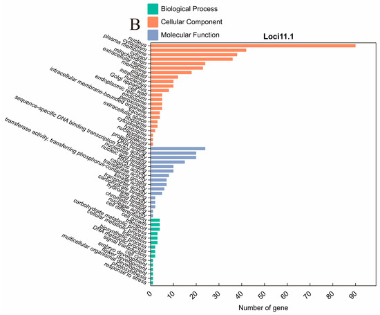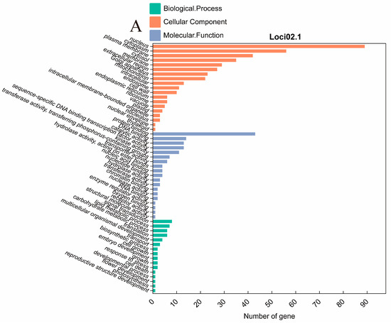 GO term enrichment analysis of the genes located within the two QTL clusters: (A) Loci02.1 and (B) Loci11.1.