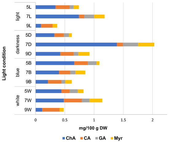 Cumulation dynamics of phenolic acid (ChA, chlorogenic acid; CA, caffeic acid; GA, gallic acid) and flavonoid (Myr, myricetin) content in the sprouts of Sofia hemp variety, grown under different lighting conditions, and harvested at different (5, 7, 9) days after sowing.