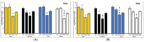 A comparison of the content of polyphenolic compounds in sprouts grown under varying light conditions showed interesting differences. Chlorogenic acid synthesis was intensified in total darkness compared to natural light conditions, while its content in sprouts grown under LED light was significantly lower (p < 0.05). On the other hand, both LED lights enhanced the synthesis of caffeic acid compared to natural light and to darkness. In a similar study, blue LED light also increased total polyphenolic and total flavonoid contents compared to natural light conditions [6]. Our results indicate that the optimal conditions for sprouts rich in chlorogenic acid, gallic acid, and myricetin appear to be cultivation in the darkness and harvesting on the seventh day after sowing, while for caffeic acid the optimal conditions are cultivation in white light and harvesting on the seventh day.