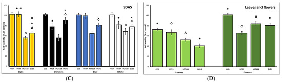 The cytotoxic effects of hemp sprout extracts (500 µg/mL) harvested after 5 (A), 7 (B), and 9 (C) days after sowing (DAS), under various lighting conditions (light, darkness, blue LED, white LED), and leaves or flowers (100 µg/mL) (D), on normal (CCD) and cancerous (HT29, HCT116, DLD1) colon cancer cells. Significant differences (p < 0.05) between different cell lines for each DAS or leaves and flowers are indicated by identical symbols.
