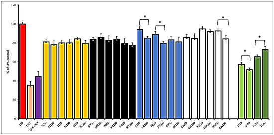 The effect of hemp sprouts harvested at different light conditions—light (L), darkness (D), blue LED (B), and white LED (W)—and leaves (LF) or flower (FL) extracts (50 and 100 µg/mL for sprouts; 20 and 40 µg/mL for LF and FL) on nitric oxide release in LPS-stimulated RAW 264.7 macrophages. Significant differences between the doses were marked by upper black line and * (p < 0.05).