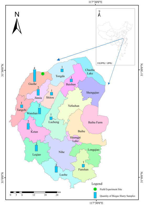 The nutrient content of biogas slurries sampled from 12 townships of Lujiang County (including Guohe Town, Jinniu Town, Ketan Town, and so on) in 2022 and 2023 was analyzed. The field experiment site, location, and quantity of biogas slurry sampling are shown in Figure 1.