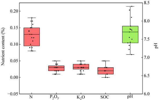 As shown in Figure 2, the N content of the biogas slurry was 0.08–0.18%, and the P and K contents were 0.01–0.05%. The soil organic C (SOC) was 0.01–0.05%, and the pH was 7.08–8.40.