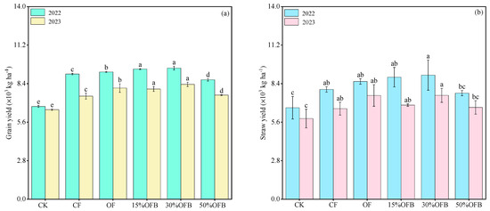 The grain and straw yields of rice in 2022 were 6737.39–9527.44 and 6654.98–9019.71 kg·ha−1, respectively (Figure 3). In 2023, rice grain and straw yields were 6508.60–8346.14 and 5857.97–7548.34 kg·ha−1, respectively, and the rice grain yield under all treatments was higher in 2022 than in 2023. Compared with CF treatment, grain and straw yields of OF treatment increased in 2022 and 2023, with grain yield increasing by 1.67% and 7.87%, respectively, and straw yield increasing by 7.20% and 14.58%, respectively. In 2022 and 2023, the rice grain yield under 15% OFB and 30% OFB treatments significantly increased (p < 0.05) compared with CF treatment. The rice grain yield was the highest after 30% OFB treatment in two years. In 2022, the grain yield of 50% OFB treatment was significantly lower than that of CF treatment (p < 0.05) by 4.52%, while there was no significant difference between 50% OFB treatment and CF treatment in 2023. In comparison to the OF treatment, the yields of rice grain and straw showed an increasing trend in both the 15% OFB and 30% OFB treatments during 2022. Furthermore, in 2023, only the 30% OFB treatment led to an elevation in both rice grain and straw yields. With the increase in the proportion of biogas slurry replacing fertilizer, the rice yield in 2022 and 2023 showed a trend of first increasing and then decreasing (30% OFB > 15% OFB > 50% OFB).
