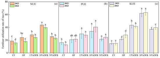 Compared with CF treatment, the N use efficiency (NUE), P use efficiency (PUE), and K use efficiency (KUE) of rice under OF treatment increased by 29.11%, 27.44%, and 43.31% in 2022, and by 15.10%, 67.71%, and 87.34% in 2023, respectively (Figure 4). The NUE, PUE, and KUE of rice treated with 15% OFB, 30% OFB, and 50% OFB were significantly increased (p < 0.05) compared with CF treatment. In contrast to OF treatment, the NUE and KUE of rice treated with 15% OFB, 30% OFB, and 50% OFB were significantly increased (p < 0.05). With the increase in the proportion of biogas slurry replacing fertilizer, the NUE, PUE, and KUE in rice in 2022 and 2023 showed a trend of first increasing and then decreasing (30% OFB > 15% OFB > 50% OFB).