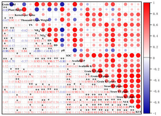 As shown in Figure 5, grain yield was significantly positively correlated with soil NH4+-N, hydrolysable N, and available P contents (p < 0.01), significantly positively correlated with soil NO3−-N, bulk density (BD), and straw P uptake (p < 0.05), significantly negatively correlated with rice plant height and soil pH (p < 0.01), and significantly negatively correlated with kernels per spike (p < 0.05). There was a significant positive correlation between SOC and N, P, and K utilization efficiency (p < 0.01). Soil TN and NO3−-N contents were significantly positively correlated with the NUE, PUE, and KUE (p < 0.05).