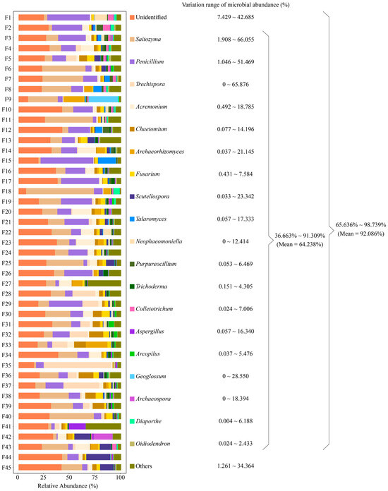 Rhizosphere soil fungal abundance analysis of 45 tea tree germplasm resources. F1~F45 denote the numbers of the 45 tea tree germplasm resources (Table S1). Only fungal genera with relative abundance of 1% or more presented in the rhizosphere soils of the 45 tea tree germplasm resources are listed in the figure, and those that did not reach 1% or more are categorized as others. The variation range of microbial abundance indicates the range of minimum to maximum abundance of the rhizosphere soil fungi of the 45 tea tree germplasm resources.