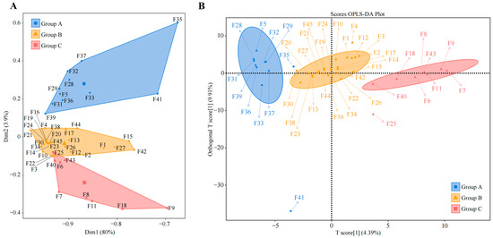 Classification and determination of tea tree germplasm resources based on the abundance of rhizosphere soil fungi. F1~F45 denote the numbers of the 45 tea tree germplasm resources (Table S1). (A) Unsupervised K-means clustering was used for automatic classification based on the abundance of soil fungi in the rhizosphere of tea tree. The three categories were defined as group A, group B, and group C, and their corresponding tea tree germplasm resources are shown in Table S5. (B) Simulated classification of key fungi based on rhizosphere soil fungal abundance of tea tree using the supervised OPLS-DA model (Figure S4).