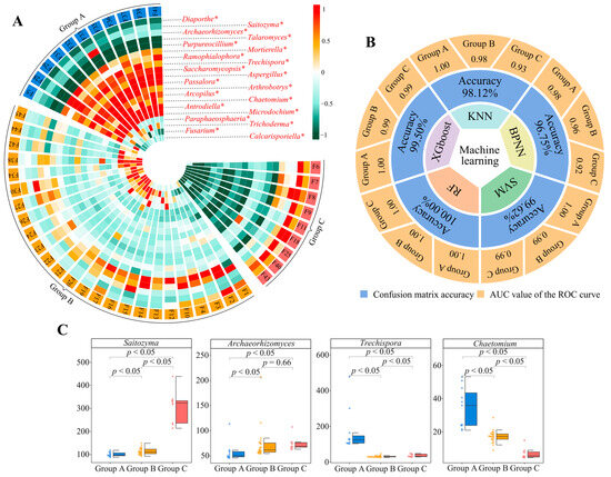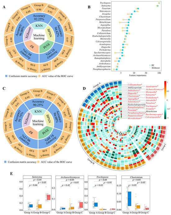 We used five machine and deep learning algorithms (KNN, BPNN, SVM, RF, and XGboost) to validate the accuracy of 181 genera of key fungi by distinguishing between groups A, B, and C and obtaining feature importance values for different fungi. The analysis revealed that the average accuracy of the five machine and deep learning simulated classifications reached 91.87% (confusion matrix), and the classification accuracy for group A, group B, and group C reached 0.90, 0.90, and 0.92 (ROC curves), respectively (Figure 3A, Figure S6). The top 30 fungal genera ranked by their feature importance values were derived from RF and XGboost (Figure S7), and 25 fungal genera were found to be shared (Figure 3B). A machine and deep learning simulation with 25 genera of characteristic fungi was performed again to verify the classification accuracy, which was found to be 89.60% on average, and the classification accuracy for group A, group B, and group C reached 0.89, 0.88, and 0.94, respectively (Figure 3C, Figure S8). The abundance analysis of the characteristic fungi revealed (Figure 3D, Figure S9) that, in terms of the abundance of 25 genera of fungi in group A, group B, and group C, 22 genera showed a significant difference (p < 0.05), and three genera showed no significant difference. Secondly, we found that, among the 22 fungal genera with significant differences, the largest abundance was found in Saitozyma (range 1.91% to 66.06%, mean 17.20%), Archaeorhizomyces (range 0.04% to 21.14%, mean 3.06%), Trechispora (range 0% to 65.88%, mean value 5.46%) and Chaetomium (range 0.08% to 14.20%, mean value 3.10%) (Figure S9).