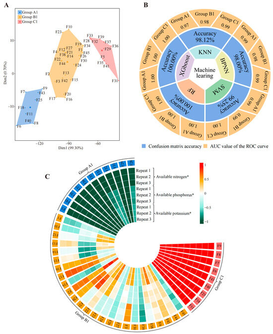 Classification of tea tree germplasm resources based on available nitrogen, phosphorus, and potassium content of soil. F1~F45 indicate the numbers of the 45 tea tree germplasm resources (see Table S1 for the tea tree varieties corresponding to the numbers). KNN, BPNN, SVM, RF, and XGboost denote five types of machine and deep learning, namely K-nearest neighbors, support vector machine, back-propagation neural network, random forest, and extreme gradient boosting. (A) Based on the available nitrogen, available phosphorus, and available potassium content of the tea tree rhizosphere soils (Figure S12), unsupervised K-means clustering was used for automatic classification. The three categories were defined as groups A1, B1, and C1, and their corresponding tea tree germplasm resources are shown in Table S6. (B) Five machine and deep learning methods were used to simulate and verify the accuracy of the classification based on the available nitrogen, available phosphorus, and available potassium content of the tea tree rhizosphere soil (Figure S12). The overall accuracy of the classification was obtained through the confusion matrix, and the accuracy for groups A1, B1, and C1 was obtained through ROC curves (Figure S13). (C) Analysis of available nitrogen, available phosphorus, and available potassium content in groups A1, B1, and C1 (* indicates that the difference in the content of this index in groups A1, B1, and C1 reaches the p < 0.05 level; Figure S14).