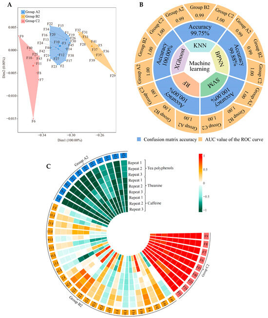 Classification of tea germplasm resources based on tea polyphenol, theanine, and caffeine content. F1~F45 indicate the numbers of the 45 tea tree germplasm resources (see Table S1 for the tea tree varieties corresponding to the numbers). KNN, BPNN, SVM, RF, and XGboost denote five types of machine and deep learning, namely K-nearest neighbors, support vector machine, back-propagation neural network, random forest, and extreme gradient boosting. (A) Based on the tea polyphenol, theanine, and caffeine content of the tea leaves (Figure S15), unsupervised K-means clustering was used for automatic classification. The three categories were defined as groups A2, B2, and C2, and their corresponding tea germplasm resources are shown in Table S7. (B) Based on the tea polyphenol, theanine, and caffeine content of the tea leaves (Figure S15), five machine and deep learning methods were used to simulate and verify the accuracy of the classification. The overall accuracy of the classification was obtained through the confusion matrix, and the accuracy of groups A1, B1, and C1 was obtained through ROC curves (Figure S16). (C) Analysis of tea polyphenols, theanine, and caffeine content in groups A2, B2, and C2 (Figure S17).