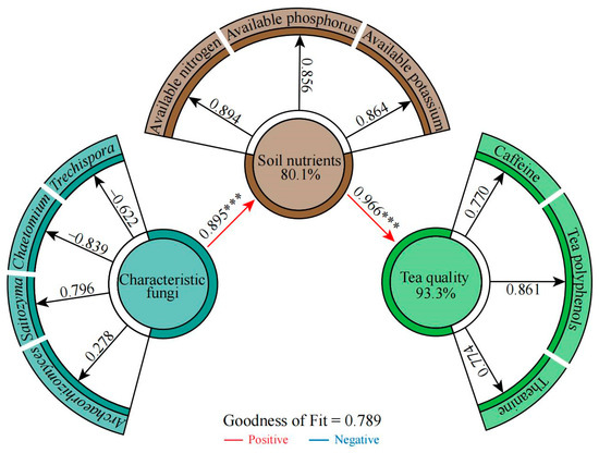 PLS-SME equations were constructed based on the quantitative data of four characteristic fungi genera; the content of soil available nitrogen, available phosphorus, and available potassium; and the content of tea polyphenols, theanine, and caffeine in tea leaves from the rhizosphere soil of 45 tea germplasm resources. Note: *** indicates that the effect value reaches the p < 0.001 level.